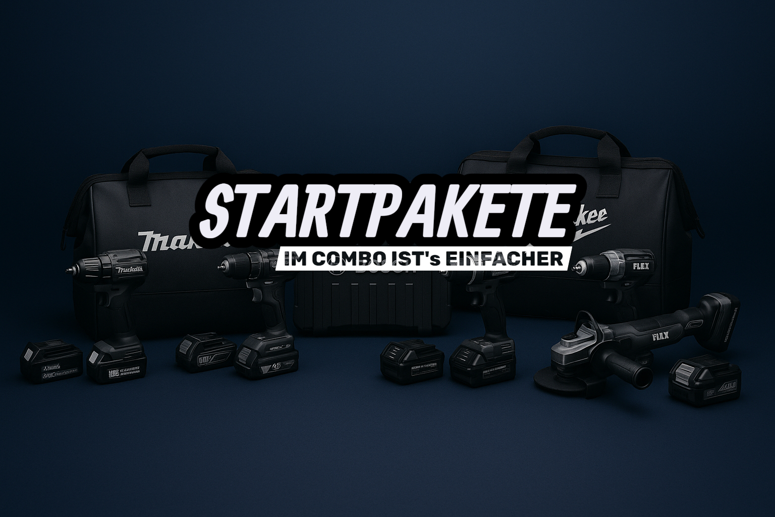 Unsere Startpakete enthalten perfekt aufeinander abgestimmte Maschinen – häufig bestehend aus Akkuschrauber, Schlagschrauber, Sägen, Winkelschleifern oder weiteren Werkzeugen. Dazu bekommst du passende Akkus und Ladegeräte, sodass du direkt loslegen kannst.